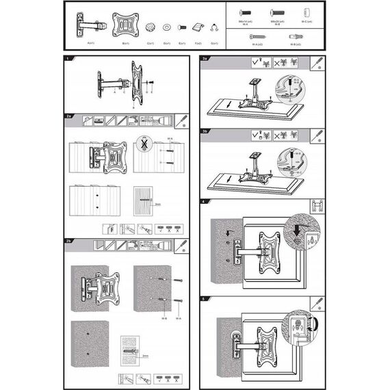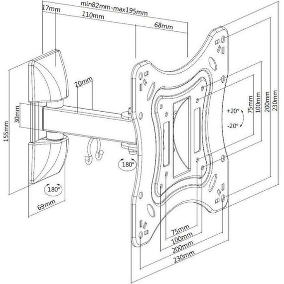 Диагональ экрана: 17"-43". VESA: 75x75, 100x100, 200x100, 200x200. Максимальная нагрузка: 20 кг. Расстояние от стены: 82-195 мм. Угол поворота: +90°~-90°. Угол наклона: +20°~-20°. Материал: холоднокатаная сталь. Протестировано весом в 2 раза больше максимально допустимого. Конструкция свободного наклона. Направляющая для кабелей.