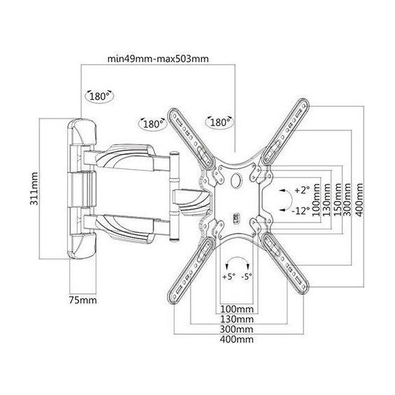 Диагональ экрана: 23"-55". * Подходит для изогнутых телевизоров. VESA: 100x100, 100x150, 200x100, 200x200, 300x200, 300x300, 400x200, 400x300, 400x400. Максимальная нагрузка: 35 кг. Расстояние от стены: 49-503 мм. Угол поворота: +90°~-90°. Угол наклона: +2°~-12°. Горизонт экрана: +5°~-5°. Материал: холоднокатаная сталь, пластик. Протестировано весом в 3 раза больше максимально допустимого. Плавно и легко наклоняется и поворачивается на шарнирах. Конструкция свободного наклона. Встроенная регулировка уровня и индикатор поворота. Декоративные накладки для кабелей. Конструкция панели с VESA съёмная для лёгкой установки.