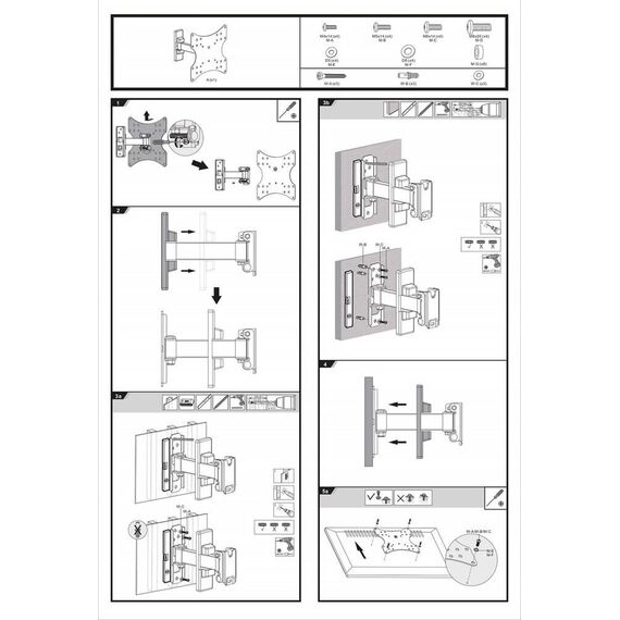 Диагональ экрана: 17"-43". VESA: 75x75, 100x100, 100x150, 150x100, 150x150, 200x100, 200x200. Максимальная нагрузка: 20 кг. Расстояние от стены: 44-192 мм. Угол поворота: +90°~-90°. Угол наклона: +3°~-10°. Горизонт экрана: +3°~-3°. Материал: холоднокатаная сталь, пластик. Протестировано весом в 2 раза больше максимально допустимого. Угол обзора легко регулируется без дополнительных инструментов. Конструкция свободного наклона. Встроенная регулировка уровня и индикатор поворота. Простая конструкция легко устанавливается.