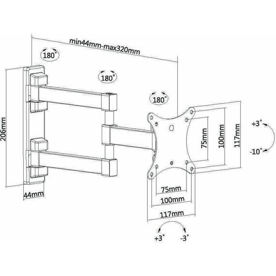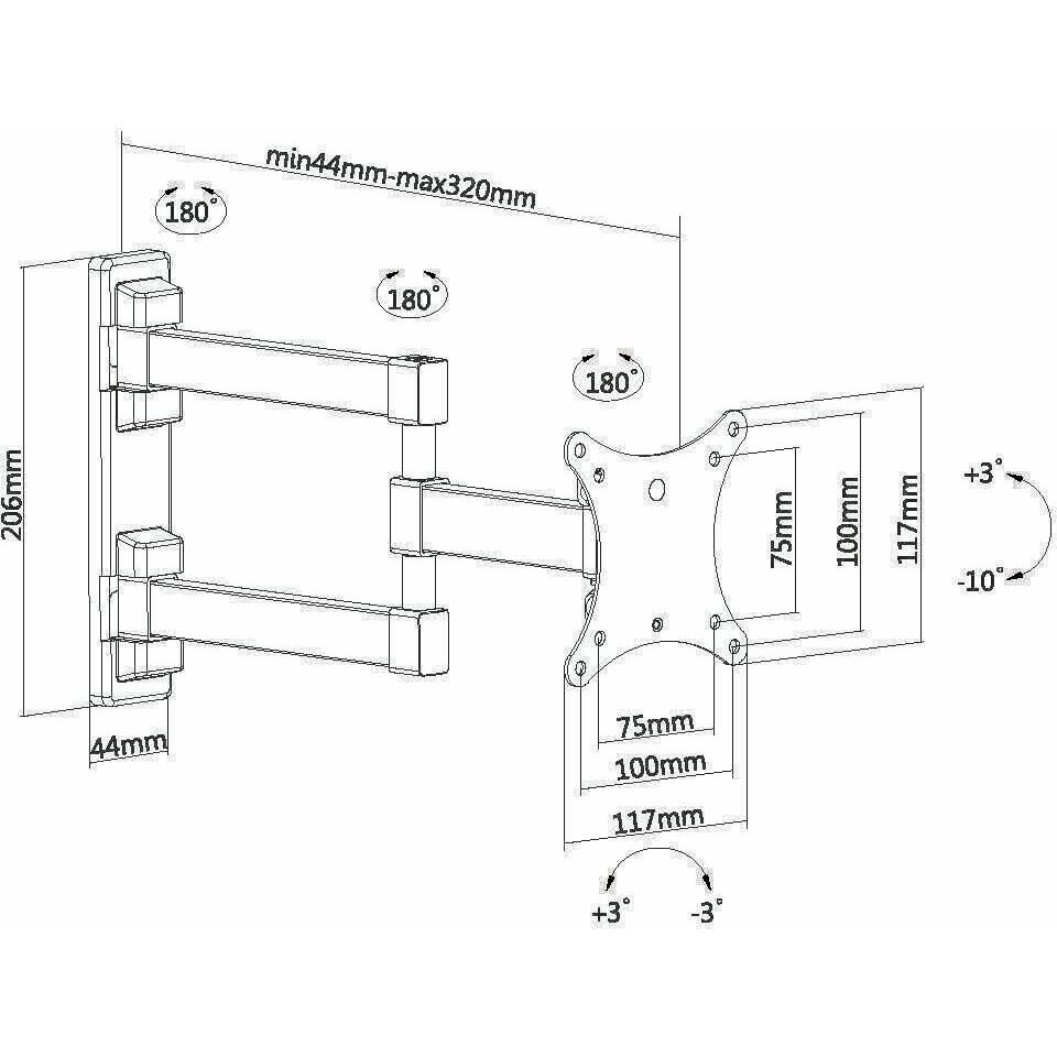 Диагональ экрана: 13"-27". VESA: 75x75,100x100. Максимальная нагрузка: 20 кг. Расстояние от стены: 44~320 мм. Угол поворота: +90°~-90°. Угол наклона: +3°~-10°. Горизонт экрана: +3°~-3°. Материал: холоднокатаная сталь. Простая сборка и установка данной модели. Протестировано с двукратным превышением максимального веса.