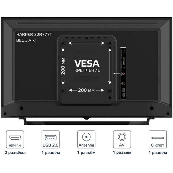 "Диагональ экрана 32"" (81 см)HD frameless Системы цветности аналогового ТВ: SECAM, PAL Цифровой тюнер DVB/T2/C Декодеры стереозвука NICAM, А2, АСЗ Формат изображения: 16:9 Разрешение экрана 1366х768 Динамический контраст 70000:1 Яркость 230 кд/м2 Угол обзора (гор/верт) 178°/178° Цифровой 3D фильтр Количество цветов 16,7 млн. Время отклика 6,5 мс Меню на русском , английском языках Телетекст Аудио 2 х 6 Вт Входы/выходы: Антенный вход Композитный AV вход mini 2 х HDMI 1 х USB CI слот SPDIF (СОАХ) Питание: Напряжение 1 ОО-240В ~ 50/60Гц Максимальная потребляемая мощность 48 Вт Потребляемая мощность в режиме ожидания - 0,5 Вт Удельная мощность рабочего режима: 0,017 Вт/кв.см Потребляемая мощность в выключенном режиме: О Размеры с подставкой: 724х480х180 мм Размеры без подставки: 724х434х84 мм Вес: 3,9кг VESA: 200х200 мм"