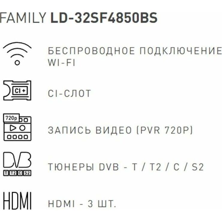 Телевизор VEKTA LD-32SF4850BS с разрешением экрана FullHD (1920х1080 px). Family - современный лаунчер для телевизоров на Android 9.0, который порадует понятным и удобным интерфейсом с возможностью объединить все онлайн кинотеатры. Характеристики: Тип: телевизор LED Модель: Vekta LD-32SF4850BS Питание: 100-240В 50/60Гц Цвет рамки: черный Цвет подставки: черный Тип подсветки экрана : Direct LED Особенности экрана: нет Диагональ экрана (дюйм) : 32" Диагональ экрана : 81 см Разрешение экрана : FullHD, 1920x1080 Формат экрана : 16: 9 Стандарты HDTV : Full HD 1080p Частота обновления экрана : 60 Гц Яркость : 240 Кд/м Контрастность : 3000 Угол обзора : 178° / 178° Операционная система : WildRed Поддержка Smart TV : есть Wi-Fi : встроенный Стандарт Wi-Fi: 4 (802.11n), 1 (802.11b), 3 (802.11g) Цифровые тюнеры : DVB-T, DVB-T2, DVB-C, DVB-S2 Телетекст: есть Мощность звука: 16 Вт Технология звука: NICAM Stereo Объемное звучание: есть Воспроизведение с внешних носителей : есть