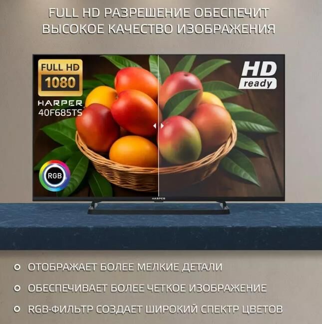 "40"" (101см),Frameless,FULL HD Bluetooth 5.0 Sber/voice assistant Android 11, 1-8G. Системы цветности аналогового ТВ: SECAM, PAL Цифровой тюнер DVB-T/T2/C SMART-TV WI-FI Декодеры стереозвука NICAM, А2 Формат изображения: 16:9 Разрешение экрана 1920х1080 Контрастность 5000:1 Яркость 240 кд/м2 Угол обзора (гор/верт) 178°/178° Цифровой 3D фильтр Количество цветов 16,7 млн. Время отклика 8 мс Меню на русском, английском языках Телетекст Аудио 2 х 8 Вт Входы/выходы: Антенный вход Композитный AV вход mini 3 х HDMI 2 х USB Аудио выход 3,5мм CI слот SPDIF (СОАХ) Питание: Напряжение 1ОО-240В 50/60Гц Максимальная потребляемая мощность 70 Вт Потребляемая мощность в режиме ожидания - 0,5 Вт Удельная мощность рабочего режима: 0,016 Вт/кв.см Потребляемая мощность в вы- ключенном режиме: О Вт Размеры с подставкой: 900x569x179 мм Размеры без подставки: 898x515x86 мм Вес: 5,8 кг VESA: 200х200 мм"