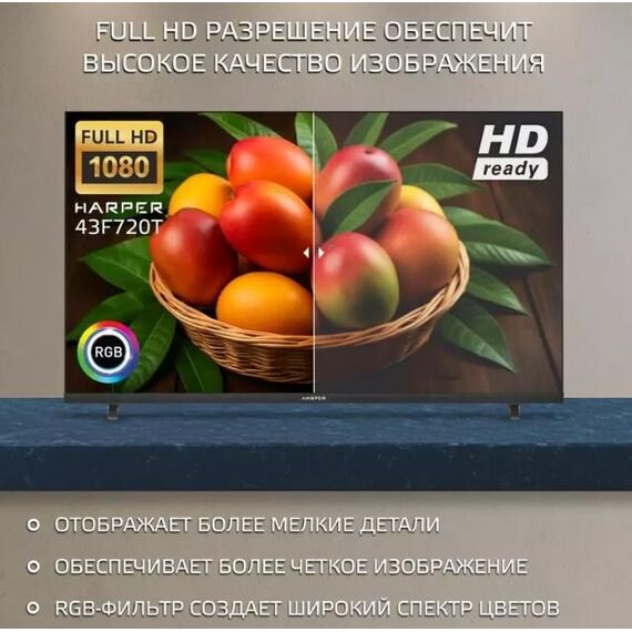 Телевизор.43" (109см)/ FULL HD 1920x1080/ цифровой тюнер DVB-T2/DVB-C/DVB-S2 /Запись ТВ программ / Электронный Телегид/ Отложенный просмотр; слот CI+ для модуля условного доступа/ формат экрана: 16: 9/4: 3/auto/ Авто динамическая контрастность: 80000: 1 / яркость: 260 кд/м2/ угол обзора (Г/В): 178°/178°/ время отклика: 9 мс/ Частота обновления экрана - 60Гц/ 3D цифровой фильтр/ VESA 300 X 200 / русское; английское меню/ телетекст/ Внутреняя память 8G) входы: антенный /разъемы для подключения: 1 USB/ 3 HDMI/ Разъем для наушников jack 3,5 / Цифровой аудио выход /вход CI+ (common interface) / Встроенная акустика 20 Вт (2x10 Вт)