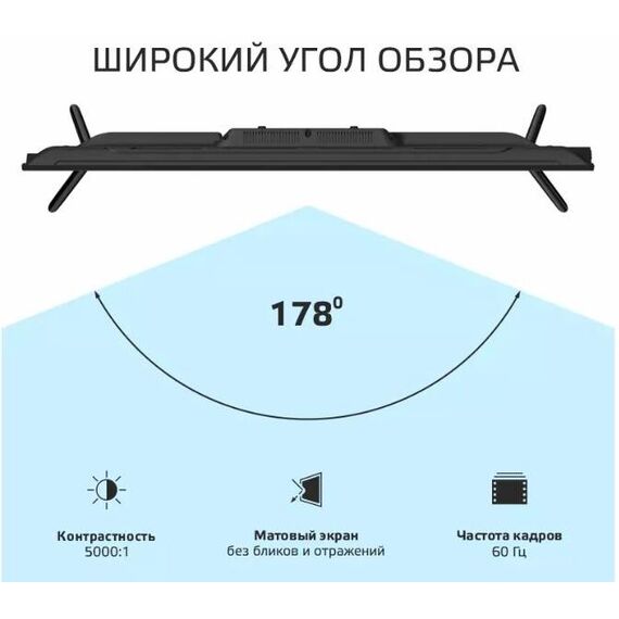 Диагональ экрана: 43 Тип панели: VA Разрешение экрана: 4K UHD Разрешение: 3840х2160 Тип подсветки экрана: Direct LED Формат экрана: 16:9 Процессор: ARM Cortex-A53 Оперативная память: 1,5 Гб Внутренняя память: 8 Гб Операционная система: Android 11 Цветовой фильтр: RGB Углы обзора: 178° Частота обновления экрана: 60 Гц Время отклика пикселя: 8 мс. Яркость: 250 Кд/м2 Контрастность: 5000:1 Количество цветов: 1,07 млрд. Дополнительно: Матовый экран без бликов и отражений Дизайн рамки: Безрамочный дизайн рамки Функция HDR: да Поддержка PAL: да Поддержка SECAM: да Поддержка NTSC: да Встроенная акустика: 16 Вт (2x8 Вт) Декодер стереозвука NICAM/A2: да Объемное звучание: да Dolby audio: да Стереозвук: да Поддержка видеоформатов/кодеков: MPEG2, MPEG4, AVI, Xvid, FLV, MOV, VOB, MKV, HEVC Поддержка аудиоформатов/кодеков: AC3, EAC3, MP3, WMA Поддержка форматов изображений: JPEG, BMP, PNG Антенный вход: да Версия HDMI: 1.4/2 Разъемов HDMI: 3 Количество разъемов USB 2.0: 2 Разъем для наушников: да