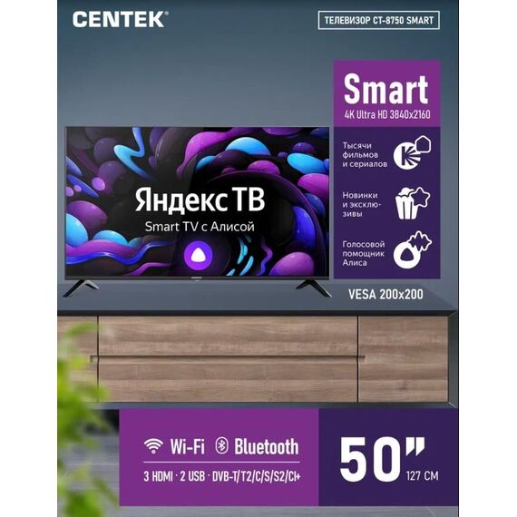 50" LED телевизор Centek CT-8750 SMART, 4K UltraHD, Wi-Fi, Bluetooth, HDMIx3, USBx2, DVB/T2 Яндекс ТВ