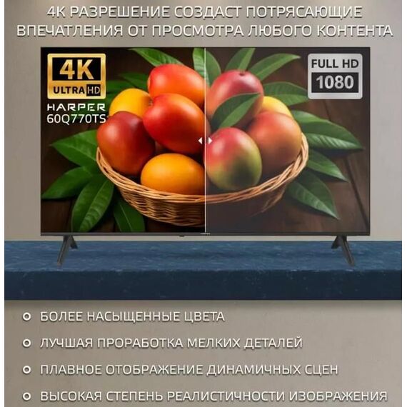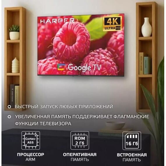 Диагональ экрана 60" (152 см); 4K QLED; Разрешение экрана 3840х2160; Смарт: Official Google Аndroid TV, Память: 2GB-RAM/16GB-ROM; Частота кадров 60/120 Гц, Dolby audio, Аудио: 20(2х10)Вт, Голосовой помощник, Функция поиска пульта, Цифровой тюнер DVB-T/T2/C/S2; Bluetooth 5.1, Wi-Fi 2.4/5 ГГц, Безрамочный дизайн, Матовый экран без бликов и отражений, Декодеры стереозвука NICAM, А2, АСЗ; Формат изображения: 16:9; Динамический контраст 1200:1; Яркость 330 кд/м2; Угол обзора (гор/верт) 178°/178°; Цифровой 3D фильтр; Количество цветов 1 млрд.; Время отклика 8 мс; Меню на русском, английском языках; Телетекст; Входы/выходы: Антенный вход, Вход для спутниковой антенны, Композитный видео/аудио вход, 3х HDMI (1.4/2.0), 2 х USB (2.0), S/PDIF (Оптический), LAN, CI слот. Размеры с подставкой: 1345х858х300 мм; Размеры без подставки: 1345х785х88 мм ; Вес: 11,9кг; VESA: 200х200; Габариты в упаковке: 1465x890x125 мм; Вес в упаковке: 16,1кг