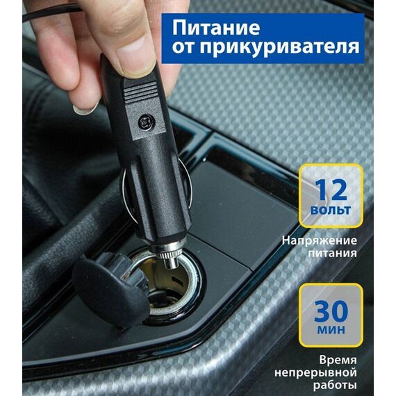 Воздушный компрессор 35 л/мин с цифровым манометром, питание от прикуривателя, светодиодный фонарь, сумка для хранения. Цифровой манометр. Система контроля давления. Накачивает колесо R-16 за 4 минуты. Светодиодный фонарь. Сумка и набор переходников в комплекте. Компрессор - 1 шт. Набор переходников - 1 шт. Сумка для хранения - 1 шт. Инструкция - 1 шт. " Производительность - 35 л/мин. Мощность - 168 Вт. Максимальное давление - 10 Атм. Максимальное токопотребление - 14 А. Время непрерывной работы - 30 мин. Напряжение питания - 12 В. Длина провода питания: 3 м. Длина воздушного шланга: 1 м