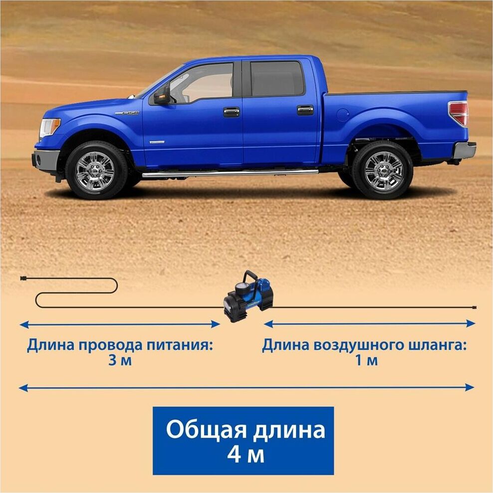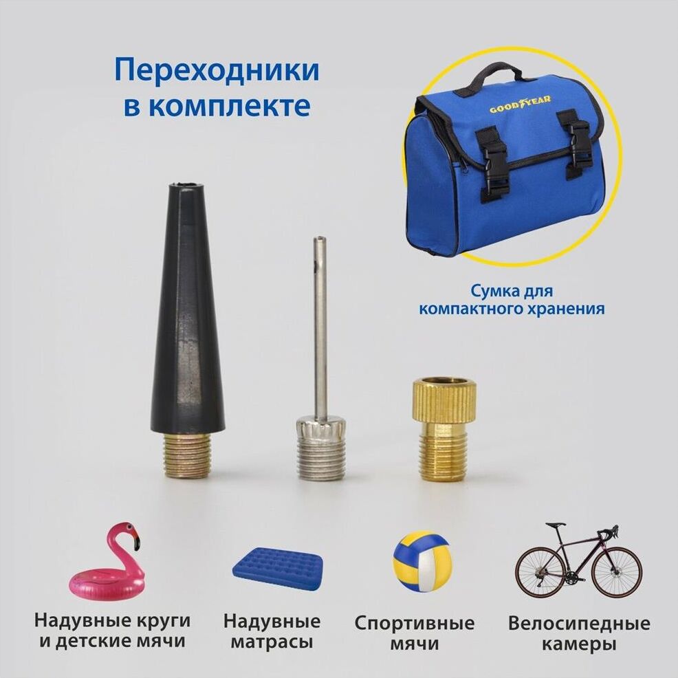 Производительность 35 л/мин, Давление до 7 атм, Для шин R13-R17, Питание 12 V, Защита флажковый предохранитель, Материал Сталь, Вес 1,9 кг, Воздушный компрессор Goodyear GY-35L LED 35 л/мин с фонарём, со съемной ручкой, сумка для хранения.