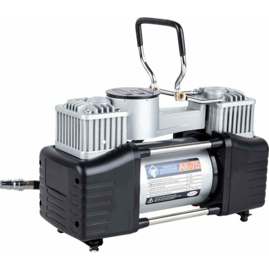 Мощность – 180 Вт. Максимальная сила тока – 15 А. Максимальное давление – до 10 кг/см2 (140PSI/10Bar) Производительность – до 75 л/мин. Шнур питания – 2,8 м. Воздушный шланг – 5м. Тканевая сумка для хранения и переноски Подключение к клеммам АКБ при помощи металлических зажимов Комплект насадок-переходников – 3 шт. Цвет- серебро Напряжение питания — 12В. Состав: металл, пластик