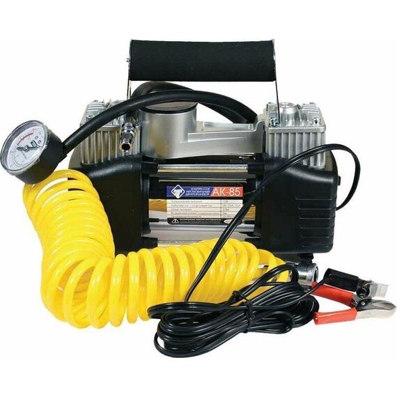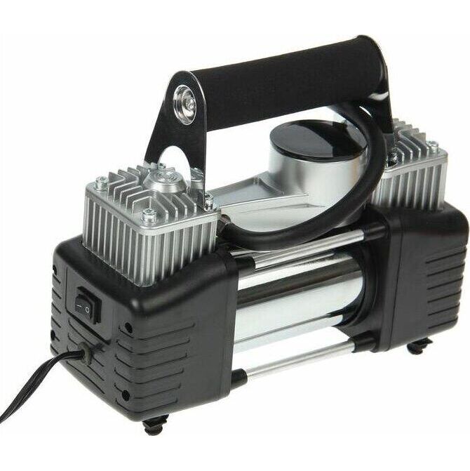 Мощность – 180 Вт. Максимальная сила тока – 15 А. Максимальное давление – до 10 кг/см (140PSI/10Bar) Производительность – до 85 л/мин. Шнур питания – 2,8 м. Воздушный шланг – 5м. Тканевая сумка для хранения и переноски Подключение к клеммам АКБ при помощи металлических зажимов Комплект насадок-переходников – 3 шт. Цвет- серебро Напряжение питания — 12В. Состав: металл, пластик