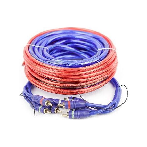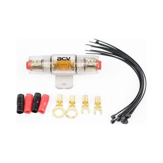 Cиловой кабель, длина 5м, 10AWG, в прозрачной красной изоляции. Толщина нити-0,20; толщина жилы 0,20*12. Наружный диаметр: 5,4ммЗаземляющий кабель, длина 1м, 10AWG, в прозрачной черной изоляцииТолщина нити-0,20; толщина жилы 0,20*12. Материал кабеля – омедненный алюминий. Диапазон рабочих температур: -40 ~ +65градНаружный диаметр: 5,4ммЧетырёхканальный межблочный кабель, длина 5м, в прозрачной синей изоляции с управляющим кабелем (ACV MKE5.4)Толщина нити-0,12; толщина жилы 0,12*30. Позолоченные RCA-коннекторы позволяют увеличить проводимость. Сигнало-передающий кабель защищен двойным экраном из поливинилхлоридной изоляции и алюминиевой фольги. Материал кабеля – омедненный алюминий. Улучшенное подавление помех, благодаря конструкции – витая пара. Держатель предохранителя ATC + предохранитель ATC 30АКруглые клеммы 10AWG – 2шт
