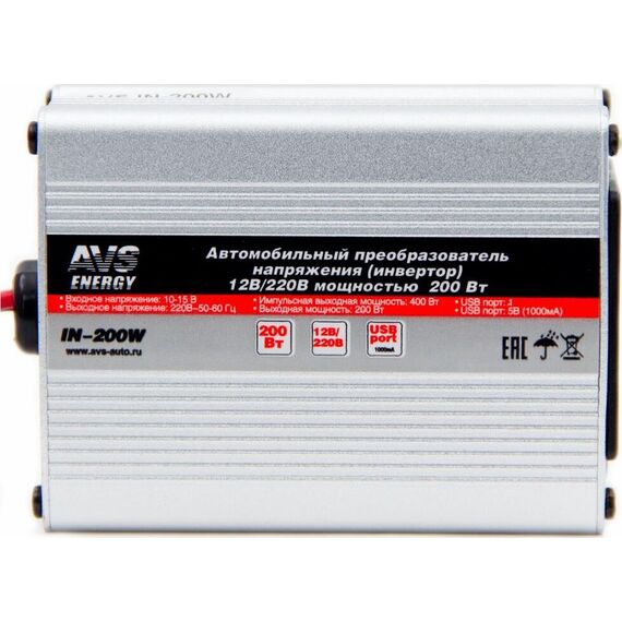 Автомобильный адаптер (инвертер) 12/220V позволяет владельцам автомобилей в дорожных условиях сделать возможной работу бытовой аудио-видео техники, компьютера, ноутбука и прочей оргтехники. Встроенная схема защиты предохраняет устройство от преждевременного выхода из строя в случаях низкого или высокого входного напряжения, неправильной полярности, короткого замыкания во входных цепях питания подключаемого устройства. Характеристики •Входное напряжение: 12В •Выходное напряжение: 220В •Выходная частота: 50Гц •Номинальная мощность: 200Вт •Допустимая пиковая мощность: 400Вт •Размеры: 8,2 х 8,9 х 4,7 см •Защита от короткого замыкания •Защита от перегрева Материал: металл, пластик Комплектация Преобразователь Состав: Металл, пластик