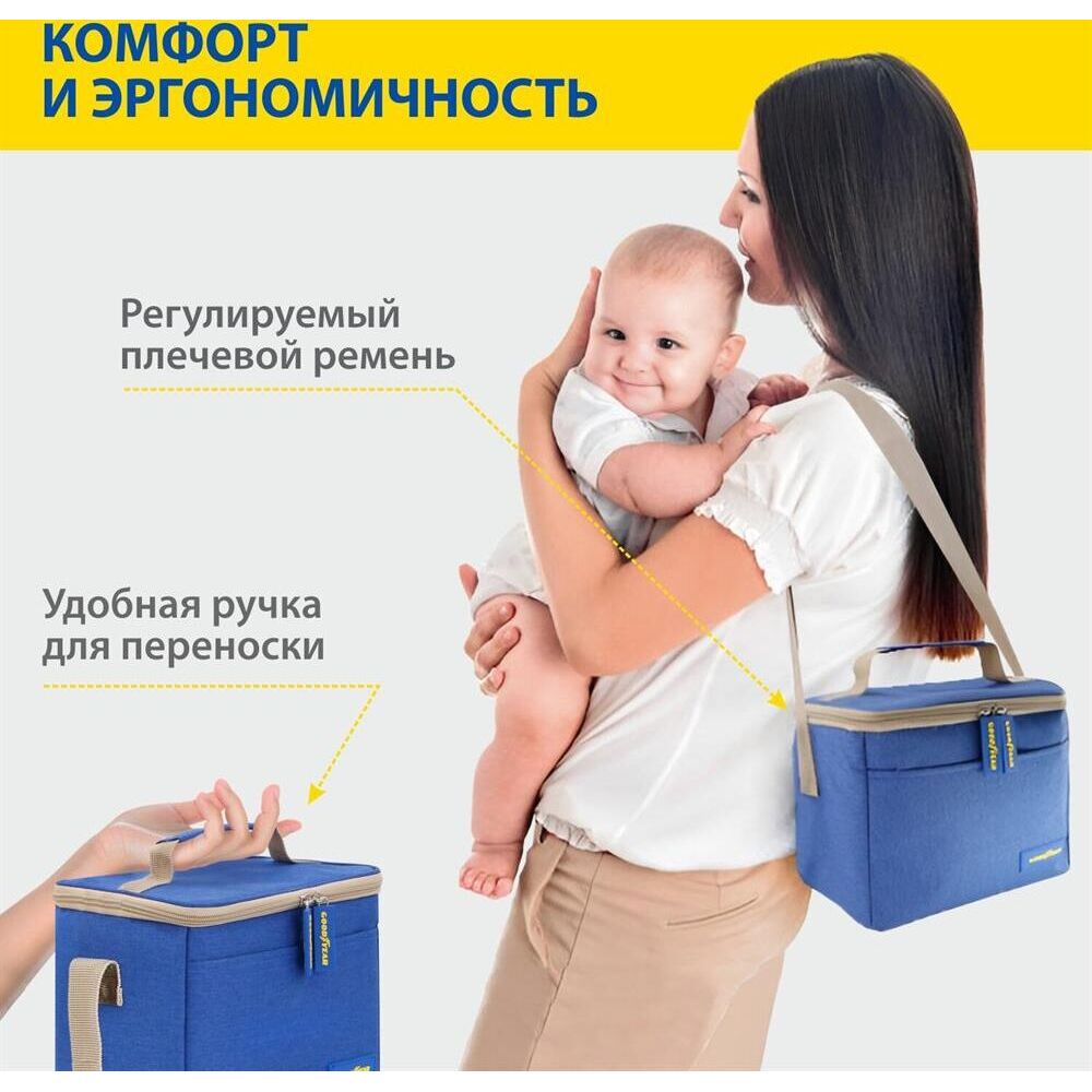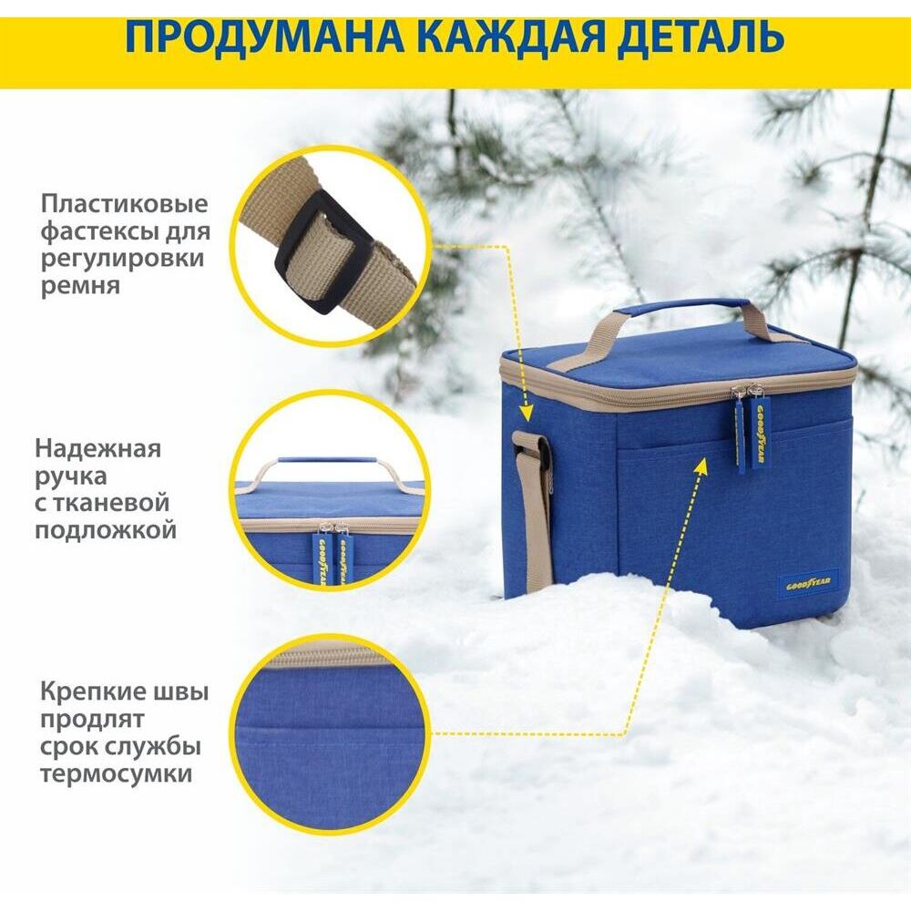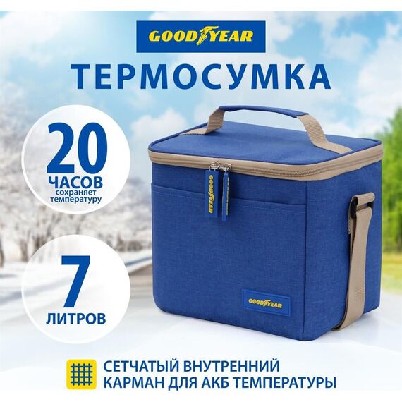 Объем 7 литров Габариты 160 х 180 х 230 мм Вес 0,27 кг Вес нагрузки 2 кг. ОПИСАНИЕ ТЕХНИЧЕСКИЕ ХАРАКТЕРИСТИКИ ПРЕИМУЩЕСТВА Термосумка Goodyear поддерживает определенную температуру внутри и сохраняет свежесть продуктов в течение долгого времени. Это незаменимый помощник при транспортировке продуктов, выездов на пикник и в путешествия, для рыбалки и туризма. Термосумка поддерживает тепло или холод до 20 часов. Она сохранит свежесть и качество охлажденного или замороженного мяса, рыбы, морепродуктов, а также овощей, фруктов, прохладительных напитков и медикаментов. Кроме того, сумка-холодильник идеально подходит для поддержания температуры готовых горячих блюд и детского питания. Внутренний металлизированный слой AlFoil делает отсек для хранения герметичным и защищает сумку от протекания. Материал не впитывает запахи и его просто поддерживать в чистоте. С наружной стороны сумка-холодильник выполнена из плотной износостойкой ткани, которая не промокает и легко моется.