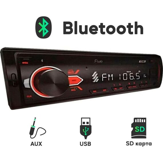 Поддерживаемые форматы MP3, WMA, WAV, FLAC Карта памяти до 32 Гб Бренд Five Тип товара автомагнитола Модель Цвет подсветки красный Максимальная выходная мощность 4x50 Вт Панель управления несъемная Напряжение 12 В Рабочая частота FM 87,5-108 МГц Чувствительность 15 дБ