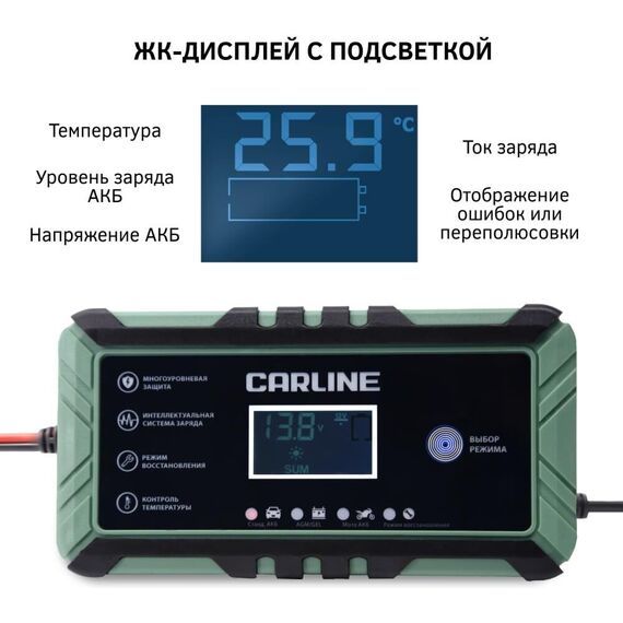 "Автоматическое импульсное зарядное устройство CARLINE CA-8A подходит для свинцово-кислотных аккумуляторов (WET, MF, GEL, AGM) емкостью до 120 Ач и напряжением 12 V / 24 V. Модель CA-8A имеет 4 режима работы: заряд стандартного заливного аккумулятора, заряд аккумулятора AGM / GEL, заряд мотоциклетного АКБ малой емкости, а также режим восстановления аккумулятора. Зарядное устройство отличается максимально простым и понятным управлением. На дисплее отображается информация о температуре, уровне заряда АКБ, напряжении аккумулятора, токе заряда, а также об ошибке АКБ или переполюсовке. Автоматические импульсные зарядные устройства CARLINE прошли сертификацию соответствия таможенного союза, что подтверждается сертификатами качества на соответствие всем необходимым ТР ТС таможенного союза ЕАС. Особенности: • Режим восстановления сильно разряженных АКБ • Режим заряда аккумуляторов малой емкости • Многоуровневая защита • Интеллектуальная система заряда • Заряд всех типов свинцово-кислотных аккумуляторов (WET, MF, GEL,"