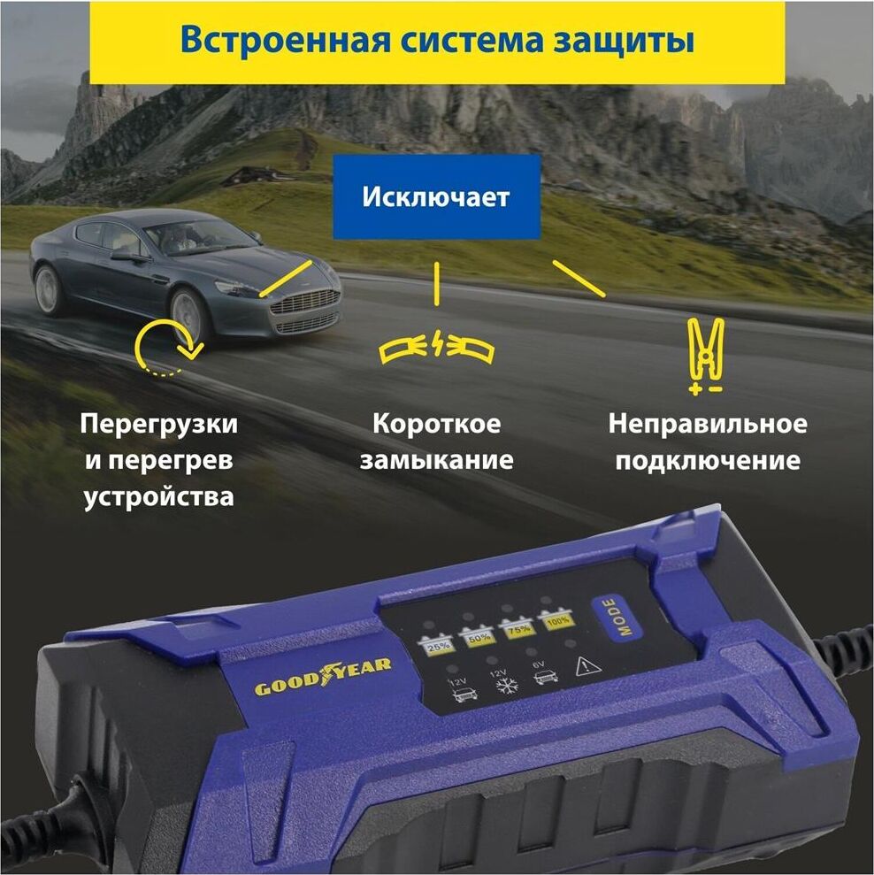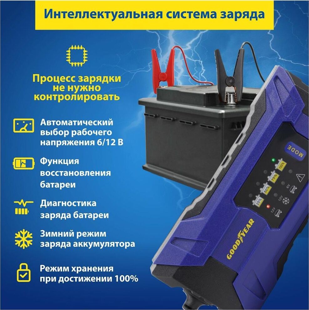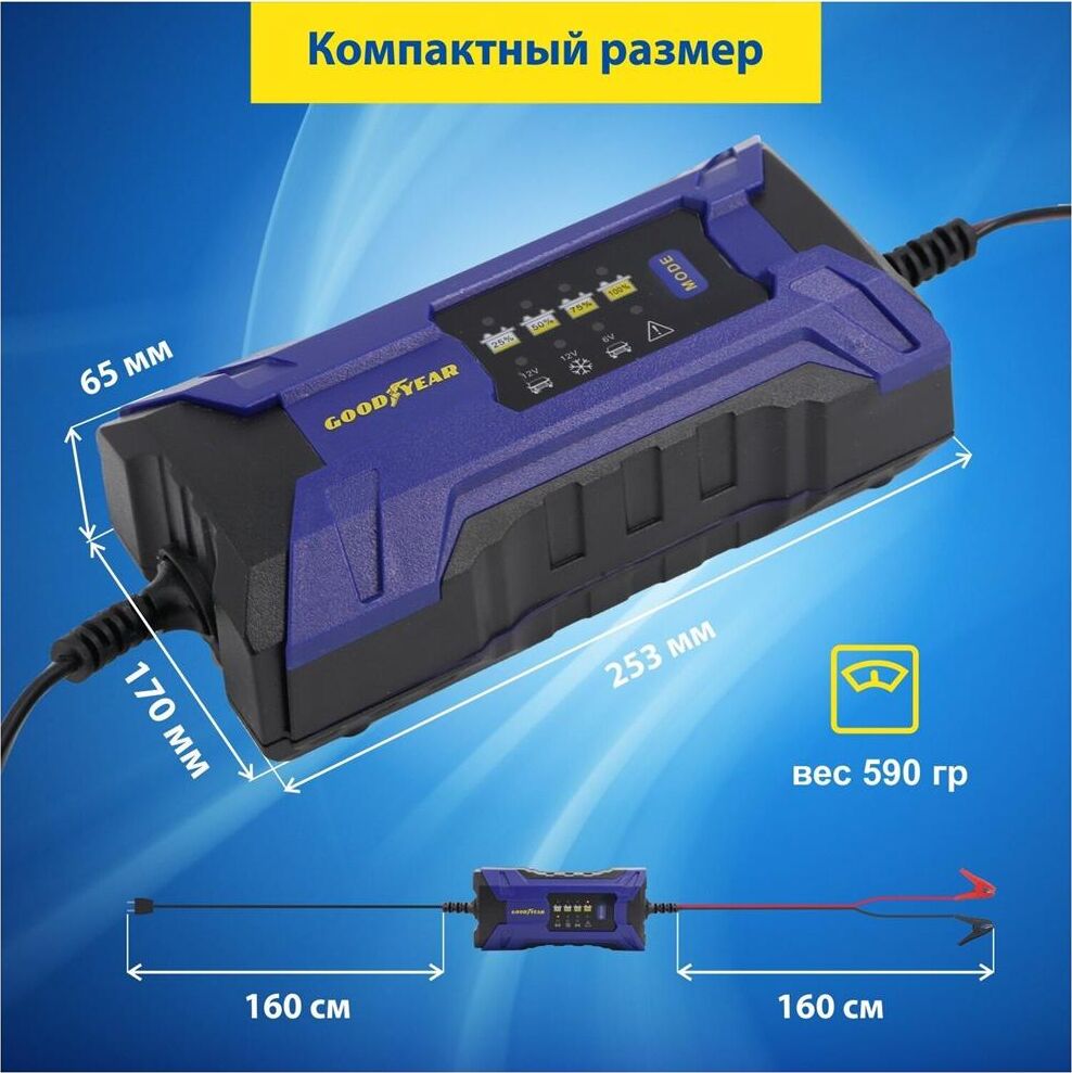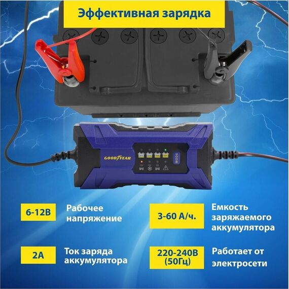 Электронное зарядное устройство Goodyear для свинцово-кислотных аккумуляторов CH-2A Электронное зарядное устройство Goodyear Smart предназначено для аккумулятора модели CH-2A. Применяется для заряда всех типов автомобильных аккумуляторов WET, MF, GEL, AGM. Особенности: - интеллектуальная система заряда, - светодиодная индикация, - зимний режим заряда аккумулятора, - индикация степени заряда аккумулятора, - усиленные зажимы, - автоматический выбор рабочего напряжения 6/12 В, - встроенная система защиты от переплюсовки, короткого замыкания и перегрева устройства, - заряд всех типов аккумуляторов (WET, MF, GEL, AGM). Технические характеристики: Заряд аккумуляторов: 6-12В. Емкость заряжаемого аккумулятора: 3-60 А/ч. Ток заряда аккумулятора: 2А. Напряжение электросети: 220-240В (50Гц). Комплектация: зарядное устройство с проводами прикуривания и усиленными зажимами, инструкция по эксплуатации, гарантийный талон.
