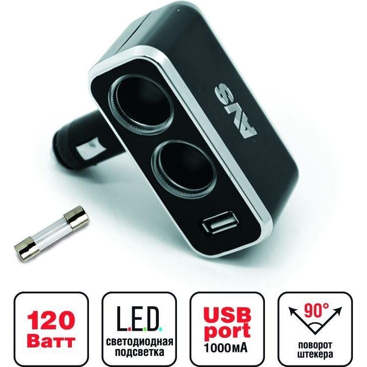 Разветвитель AVS CS211U прикуривателя 12/24 (на 2 выхода+USB) 43254