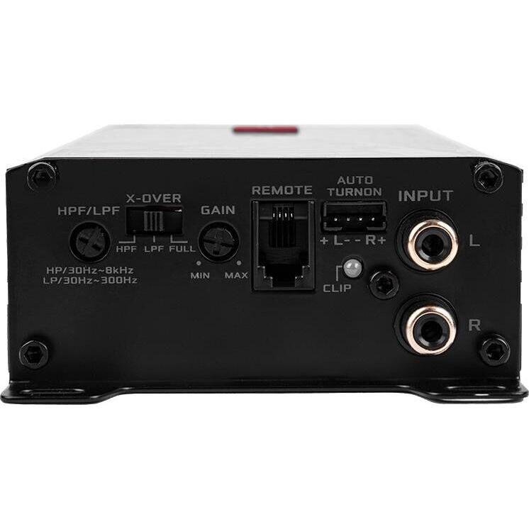 Пиковая мощность: 300 Вт Номинальная мощность 4 Ом: СТЕРЕО 90Вт х 2, MOHO в мостовом включении: 300Вт х 1 Номинальная мощность 2 Ом: СТЕРЕО 150Вт х 2 Чувствительность: 200 мВ Отношение сигнал/шум: >100 дБ Коэффициент гармонических искажений: (THD) @ 1 кГц (4 Ом) 0,05% Особенности модели Стабильная работа на нагрузках: 2 и 4 Ом Номинал предохранителя: 2х20 А Диапазон частот: 10 Гц ~ 50 кГц Общие характеристики Размеры: 130x85x38 мм Питание Рабочее напряжение: 12В - 16В пост. ток Разделение каналов Разделение каналов: >66 дБ Low pass фильтр: 30 Гц ~ 300 Гц High pass фильтр: 30 Гц ~ 8 кГц Число каналов: 2/1