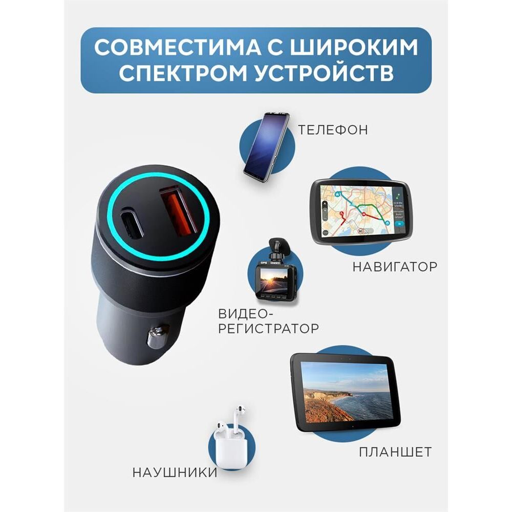 Автомобильное зарядное устройство c двумя портами USB-С и USB-С предназначено для зарядки электронных устройств в автомобиле. Суммарная мощность составляет 40 Вт, что позволяет заряжать несколько устройств одновременно. Разъемы поддерживают стандарт быстрой зарядки Power Delivery. Автозарядка оснащена световой индикацией, которая обеспечивает удобство использования в темное время суток. Зарядное устройство выполнено из прочного пластика, что гарантирует долгий срок службы. Изделие оснащено многоуровневой защитой от перенапряжения, короткого замыкания и перегрева.