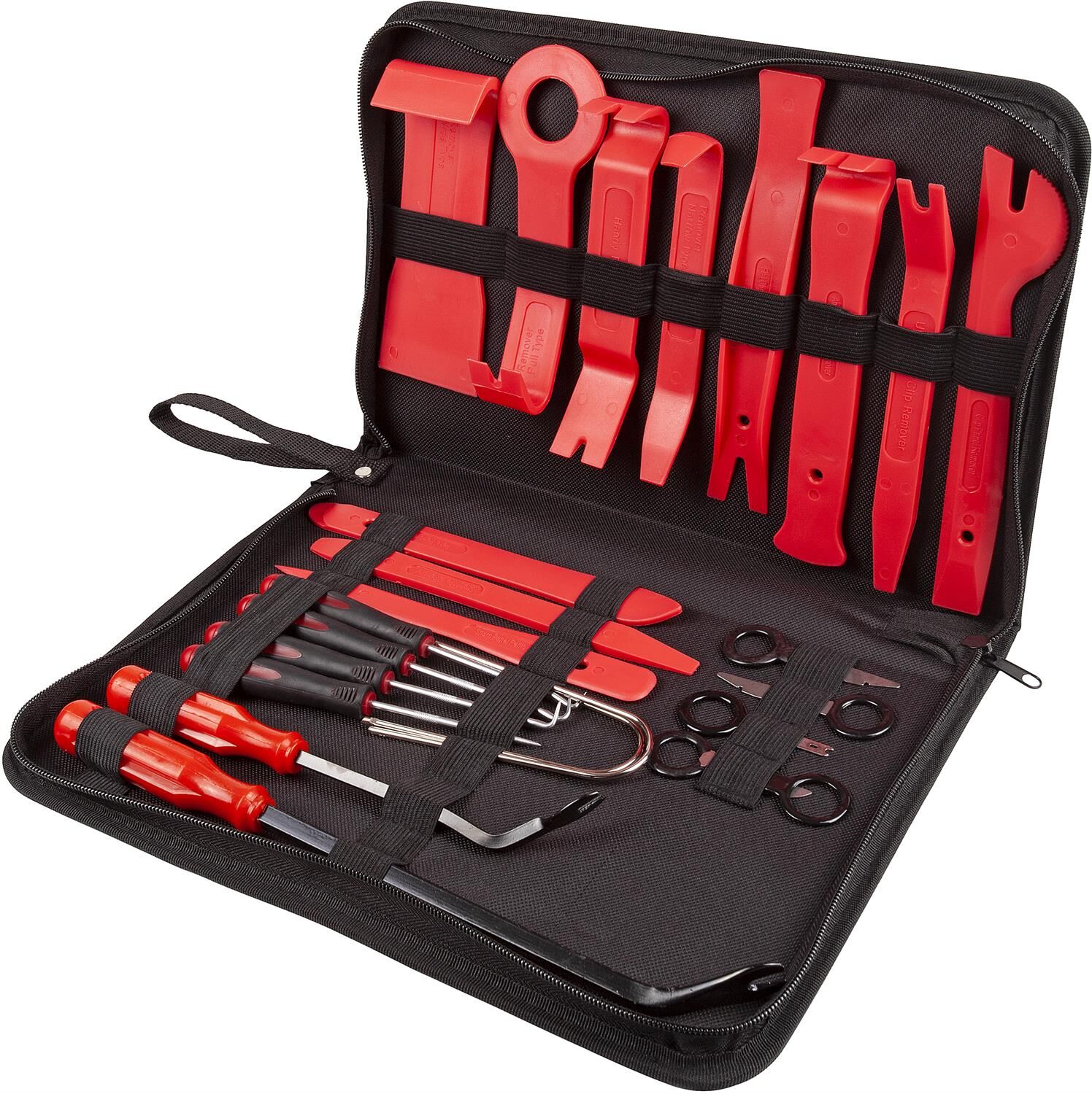 В Комплект для демонтажа панелей салона и медиа устройств AV Steel 25 предметов входят: Лопатки для демонтажа -11шт Съемники клипс - 2шт Крючки для демонтажа сальников - 4шт Приспособления для демонтажа медиаустройств - 7 шт. Сумка на молнии - 1шт. Размеры рабочих диаметров съемников: Съемники металлические - рабочий диаметр 5,6 мм и 7,4 мм Съемники пластиковые - рабочий диаметр 5,4 мм; 5,6 мм; 5,8 мм; 6,4 мм.
