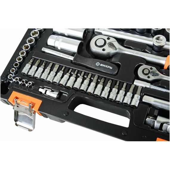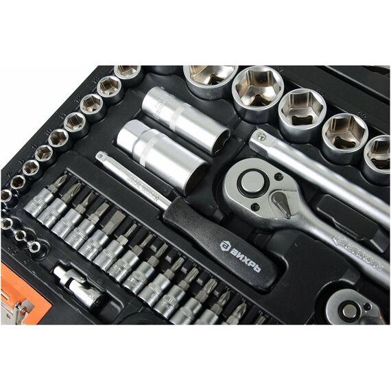 Набор инструмента вихрь предназначен для ремонта автомобилей, мотоциклов, садовой и другой техники. Подходит как для использования на станциях технического обслуживания, так и в бытовом применении дома или на даче. Инструмент изготовлен в соответствии с международными стандартами. Головки и комбинированные ключи изготовлены из хромованадиевой стали, придающей инструменту высокую твердость и легкость.