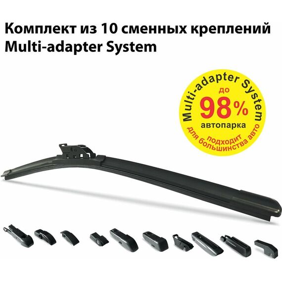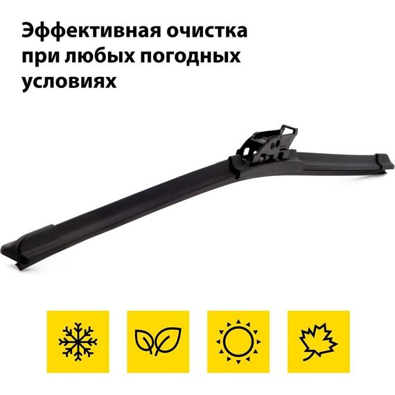Щетка бескаркасная можно устанавливать как на классические, так и на распашные системы стеклоочистителей. Симметричный аэродинамический спойлер обеспечивает идеальное прилегание лезвия к стеклу и качественную очистку на высокой скорости. В комплекте 10 адаптеров, благодаря которым щетки подходят к 98% автомобилей российского автопарка. Адаптеры применимы к поводкам с типом креплений: " Hook " Bayonet " Push Button 16mm " Push Button 19mm " Top Lock 15mm " Pinch Tab 15mm " Side Pin 22mm " Claw " Bayonet Arm " Side pin arm 5mm " Side Pin 17mm " Материал лезвия: каучук с графитовым покрытием " Всесезонность