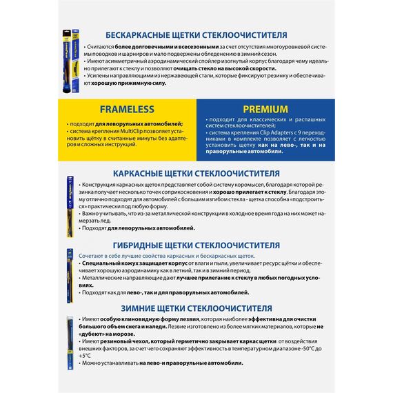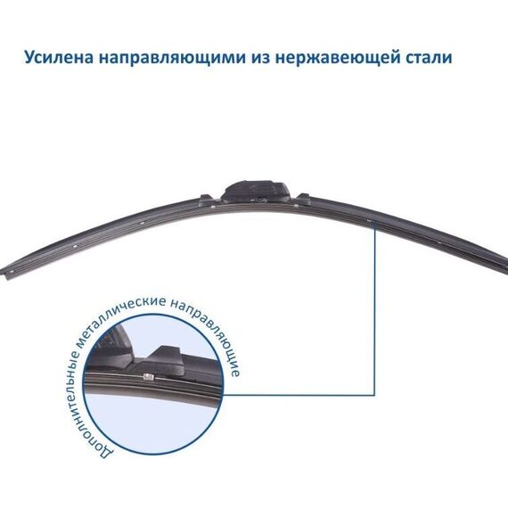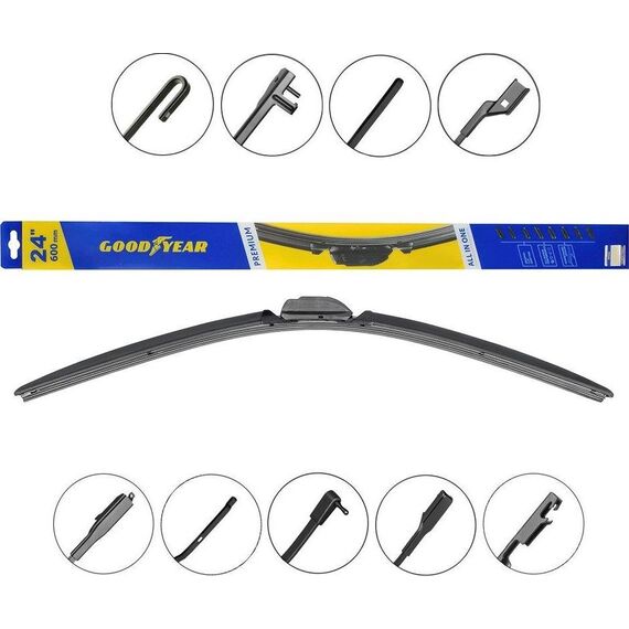 Уникальная система крепления адаптеров Clip Adapters (8 адаптеров на 11 видов крепления) позволяет использовать GOODYEAR PREMIUM на 99,8% всех моделей легковых автомобилей, в том числе с правым рулём Симметричный спойлер уникален в своём классе и выполнен из термопластичного эластомера, что делает его устойчивым к деформациям. Выполнен в виде литой конструкции и не имеет боковых заглушек, что значительно снижает обмерзание краёв щётки. Конструкция крепления лезвия имеет не только металлическую пластину на которой крепится лезвие, но и две дополнительные направляющие из нержавеющей стали, которые обеспечивают более прочное крепление резинового лезвия. Резиновое лезвие класса Triple A (ААА). Лезвие проходит процедуру полировки удаление шероховатостей поверхности.