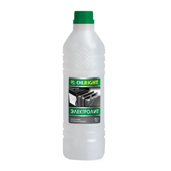 Есть два вида Электролита. Первый (зелёная крышка на фотографии) - это Электролит корректирующий 1,34 г/куб. OILRIGHT Служит для увеличения пониженной плотности электролита в кислотных аккумуляторных батареях легкового и грузового автотранспорта.