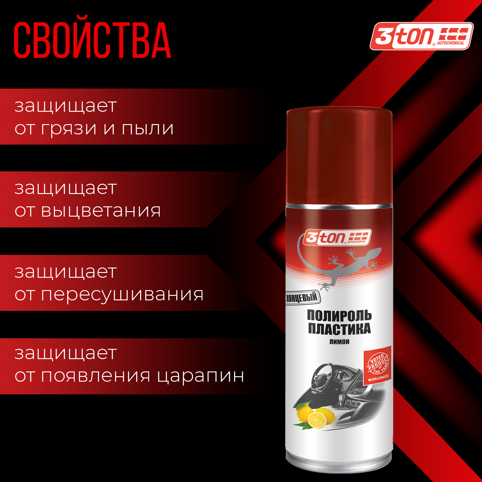 Полироль пластика 3ton ТС-516 PLASTIC POLISH лимон 335мл - предназначен для ухода за пластиковыми деталями кузова и салона автомобилей (приборная доска, дверные панели, центральная консоль, молдинг, бампер, др.). Обеспечивает защиту от высыхания и растрескивания, воздействия ультрафиолетовых лучей и влаги, восстанавливает глянец поверхностей. Обладает приятным ароматом.