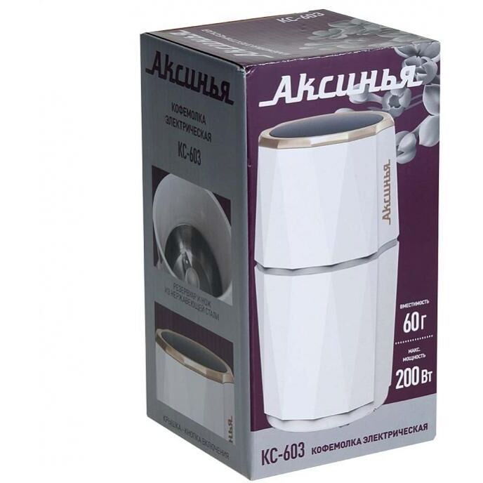 Параметры Максимальная мощность 200 Вт Номинальная потребляемая мощность 150 Вт Вместимость резервуара для кофе 60 г Описание Кофемолка - устройство для размола зерен кофе в бытовых и аналогичных условиях Принцип работы роторной (ножевой) кофемолки состоит в том, что кофейные зерна дробит, одновременно перемешивая, вращающийся с большой скоростью острый стальной нож Тонкость помола зерен определяется временем работы кофемолки Пригодна для перемалывания кофе, орехов и специй Цвет: белый Контейнер для кофе из нержавеющей стали Нож из нержавеющей стали со специальной заточкой лезвий обеспечивает идеальный помол кофе Противоскользящие прорезиненные ножки Блокировка включения при снятой крышке Упаковка: цветная коробка