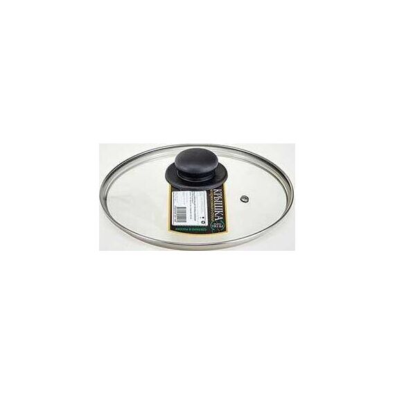 Крышка изготовлена из термостойкого стекла. снабжена пароотводом и имеет металлический обод. Пластиковая ручка на крышке не нагревается, имеет эргономичную форму и не скользит в руке. Можно мыть в посудомоечной машине. Очень удобна в использовании, т.к. позволяет контролировать процесс приготовления пищи не открывая сковородку или кастрюлю. Диаметр 22 см.