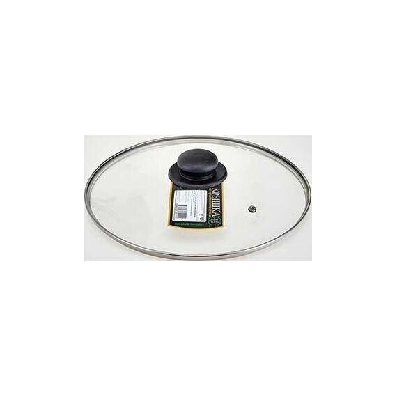 Крышка изготовлена из термостойкого стекла. снабжена пароотводом и имеет металлический обод. Пластиковая ручка на крышке не нагревается, имеет эргономичную форму и не скользит в руке. Можно мыть в посудомоечной машине. Очень удобна в использовании, т.к. позволяет контролировать процесс приготовления пищи не открывая сковородку или кастрюлю. Диаметр 28 см.