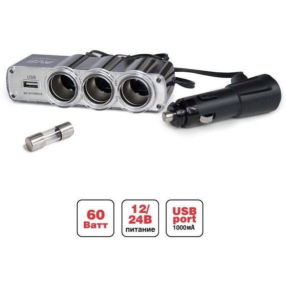 Разветвитель позволяет подключать до 4-х устройств одновременно в разъем прикуривателя через 3 собственных разъема прикуривателя и USB порт. Крепкое надежное устройство в корпусе из огнестойкого пластика. Защита от короткого замыкания и перепадов напряжения. Возможность установки в любой части автомобиля, благодаря проводу длиной 1 метр. Работа в сетях с номинальным напряжением 12В и 24В. Универсален для любых автомобилей. Характеристики •Питание: 12/24 В •Мощность: 60 Вт •Максимальный выходной ток: 5 А •Защита от короткого замыкания •Количество гнезд: 3 •USB порт: 1 •Выходной ток USB порта: 1000 мА •Длина провода: 1 м •Светодиодный индикатор сети •Плавкий предохранитель в корпусе штекера Материал: пластик Комплектация •Разветвитель •Предохранитель