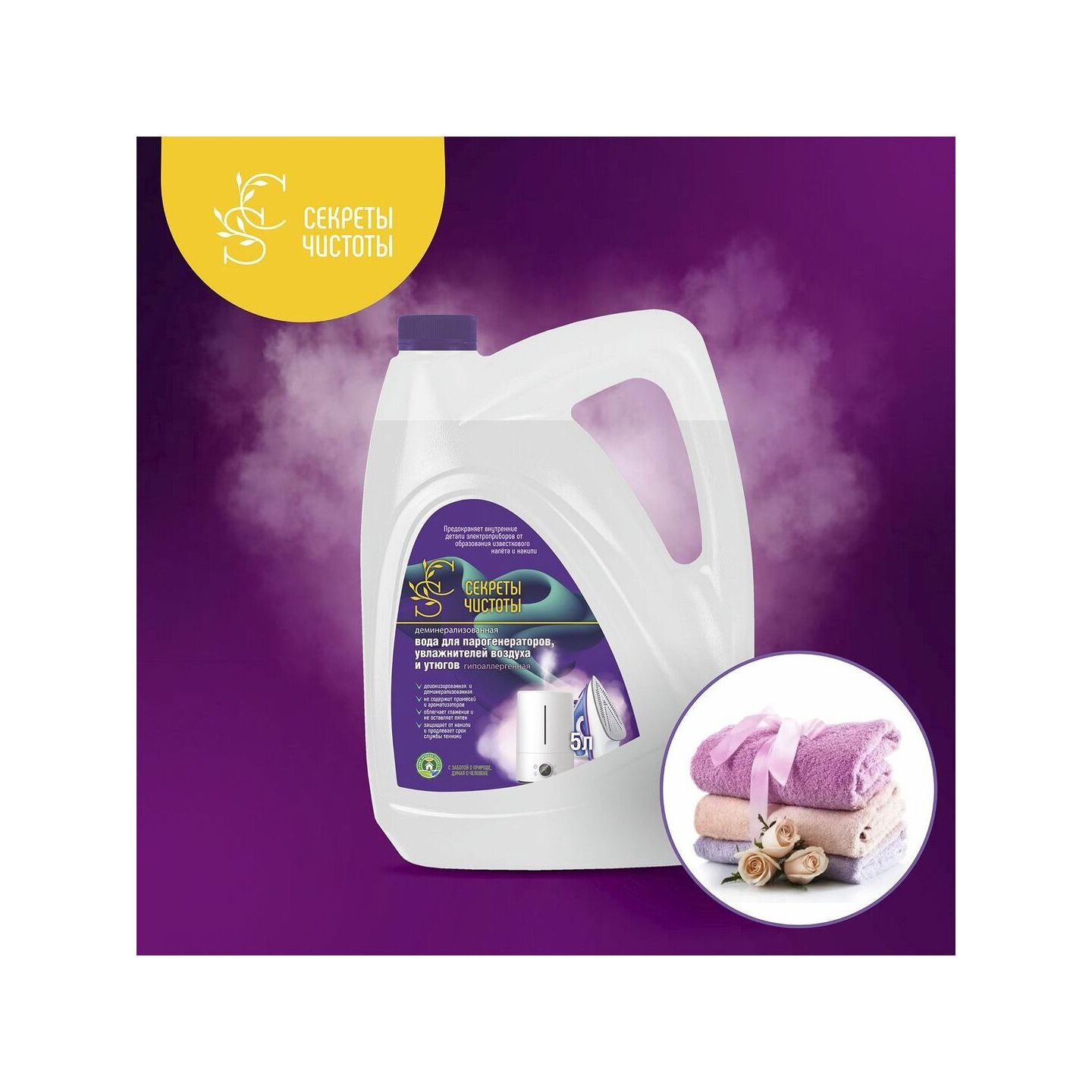 Вода для парогенераторов увлажнителей воздуха и утюгов 5 л "Секреты Чистоты" деминерализованная без ароматизатора