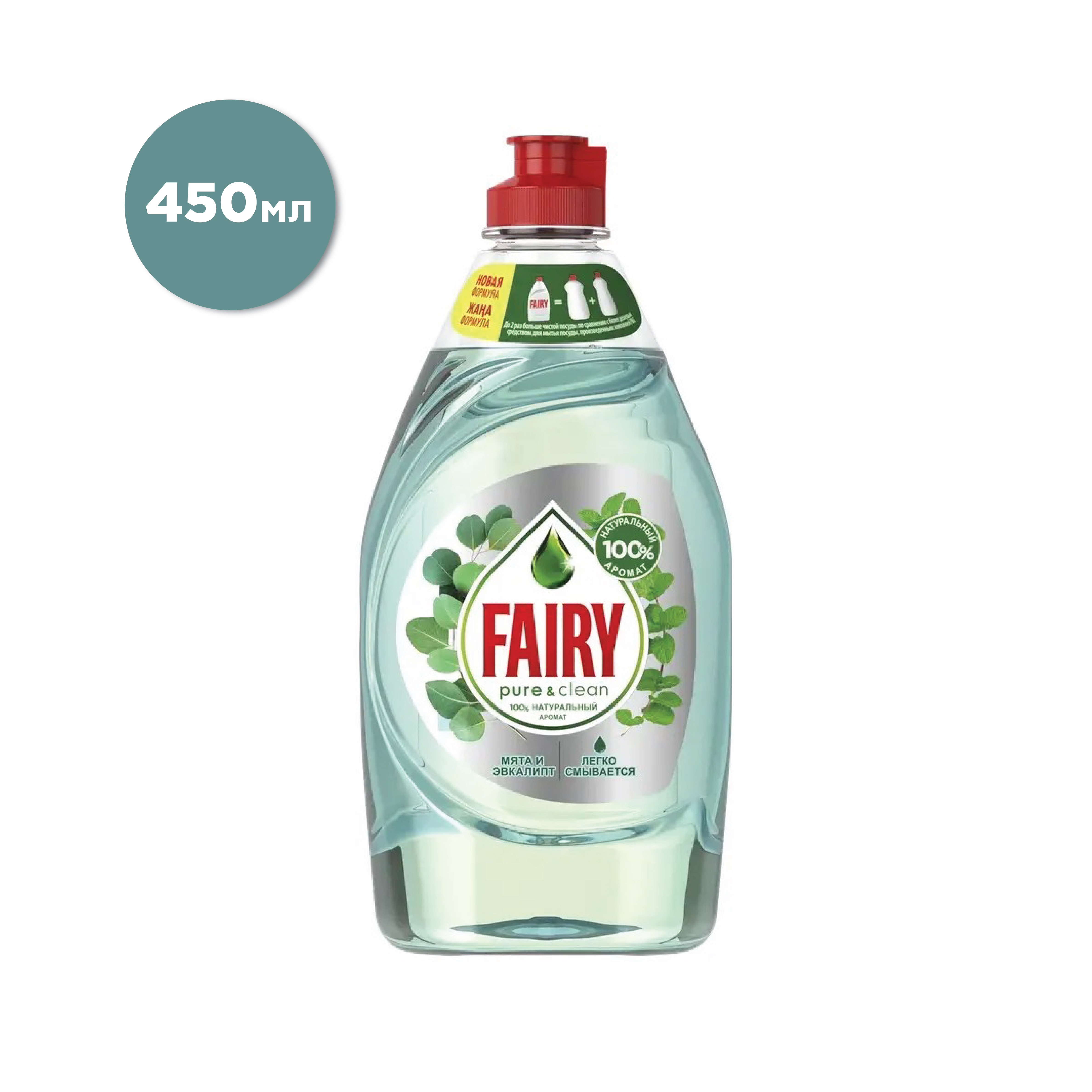 Средство для мытья посуды Fairy Pure&Clean Мята и эвкалипт, 450 мл. Средство для мытья посуды Fairy Pure & Clean сочетает в себе высокую эффективность Fairy в борьбе с загрязнениями и 100% натуральный аромат Освежающей Мяты и Эвкалипта. Формула легко смывается и дерматологически протестирована Ассоциацией здоровья кожи (Skin Health Alliance) и подходит для мытья овощей, фруктов и детских игрушек. 100% натуральный аромат Освежающей Мяты и Эвкалипта. Эффективное очищение, полностью удаляет остатки жира. Легко смывается водой. Образует стойкую пену, поэтому одной капли хватает надолго.