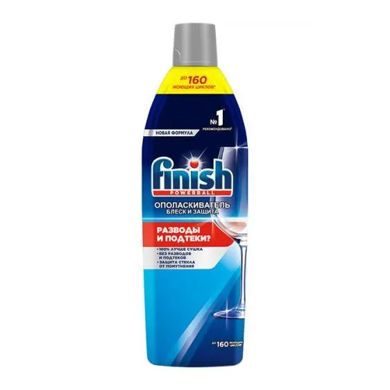 Ополаскиватель Finish обеспечивает более равномерное и быстрое высыхание посуды без подтеков. Защищает стекло от помутнения. Придает ослепительный блеск вашей посуде. Не дает остаткам пищи и напитков оседать на посуде в конце цикла мойки.