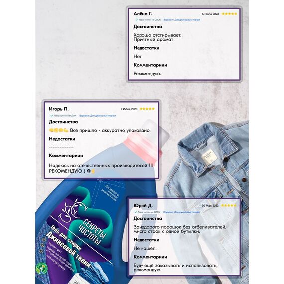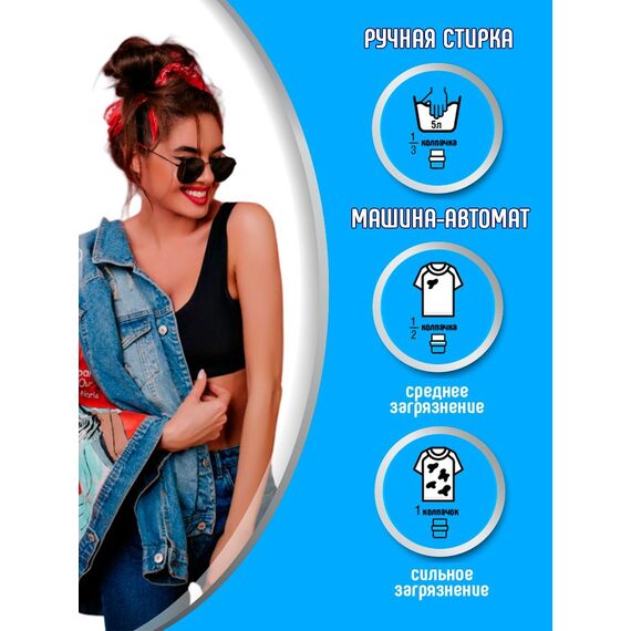 Гель для стирки любых изделий из джинсовых тканей в стиральных машинах-автоматах и ручной стирки. Благодаря своему составу может использоваться в жесткой воде. Содержит оптимально сбалансированный комплекс веществ, удаляющих загрязнения с тканей, сохраняя их яркость. Максимально деликатен к синему пигменту джинсовой одежды. Уникальная формула средства, включающая энзимы, эффективно удаляет сложные загрязнения даже в холодной воде, защищая структуру и цвет ткани. После стирки выполаскивается из волокон ткани, оставляя чистоту и свежий аромат. Сохраняет мягкость при последующей барабанной или открытой сушке изделий.