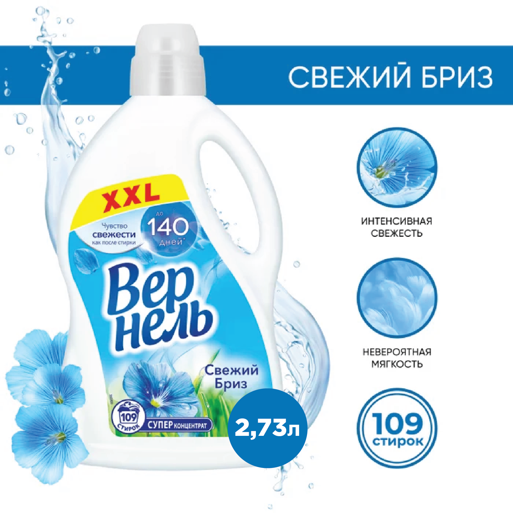 Концентрированный кондиционер для белья "Вернель Свежий бриз" 2.73л (109 стирок) подарит белью не только невероятную мягкость, но и легкий пробуждающий аромат. Преимущества кондиционера для белья "Вернель": средство "Вернель" имеет концентрированную формулу, обеспечивающую мягкость и свежесть белью. Благодаря специальным аромакапсулам в составе кондиционер позволит наслаждаться интенсивным ароматом белья до 140 дней. Кондиционер для стирки облегчает глажку и обладает антистатическим эффектом. "Вернель" идеально подходит для регулярного ухода за бельем благодаря эффективности и простоте использования. На одну стирку достаточно меньше половины колпачка средства. Благодаря удобной крышке-дозатору вы всегда будете знать, сколько ополаскивателя для белья необходимо добавить в отделение для кондиционера в стиральной машине или в воду во время последнего полоскания при ручной стирке.