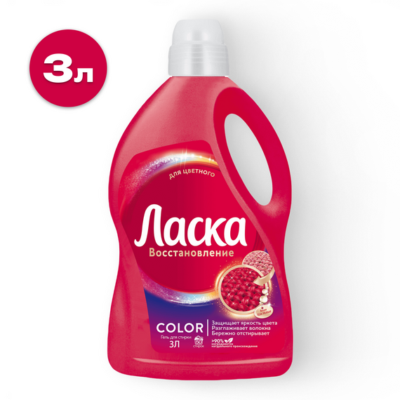 Гель для стирки "Ласка Восстановление Color" для цветного белья. Жидкий порошок "Ласка Восстановление Color" для цветного эффективно и бережно отстирывает загрязнения на одежде, восстанавливая яркость цвета и сохраняя прочность волокон ткани. В отличие от обычного стирального порошка, "Ласка" содержит цветозащитные ингредиенты, которые поддерживают стойкость цвета одежды. Активные компоненты способствуют уменьшению количества катышков на ткани. Формула содержит более 90% ингредиентов натурального происхождения. Преимущества геля для стирки "Ласка": бережно и эффективно отстирывает загрязнения. Восстанавливает и защищает яркость цвета. Сохраняет форму ткани и препятствует появлению катышков. Не оставляет разводов. Гель Laska удобен в использовании: дозируйте жидкое средство согласно инструкции, заливайте его в отделение для стирального порошка или добавьте мерный колпачок со средством в барабан стиральной машины. Цвет геля может варьироваться от молочного до светло-розового.