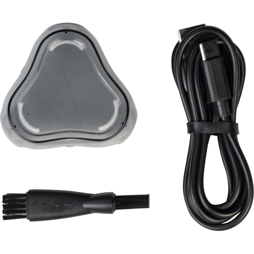 Энергоемкий Li-ion аккумулятор. Емкость аккумулятора: 600 мА/ч. Время непрерывной работы: до 1,5 ч. Время зарядки: около 1 ч. Ножи из нержавеющей стали. Три независимых плавающих головки. Встроенный триммер для подравнивания висков, бороды, усов. Возможность промывки бреющего блока. Индикатор заряда . Индикатор работы. Потребляемая мощность: 5 Вт.. Напряжение аккумулятора: 3,7 В. Входное постоянное напряжение бритвы: 5 В. Максимальный входной ток: 1 А. USB зарядка. Длина USB кабеля: 80 см. КОМПЛЕКТАЦИЯ: USB кабель . Щетка для очистки. Защитный колпачок для бреющего блока.