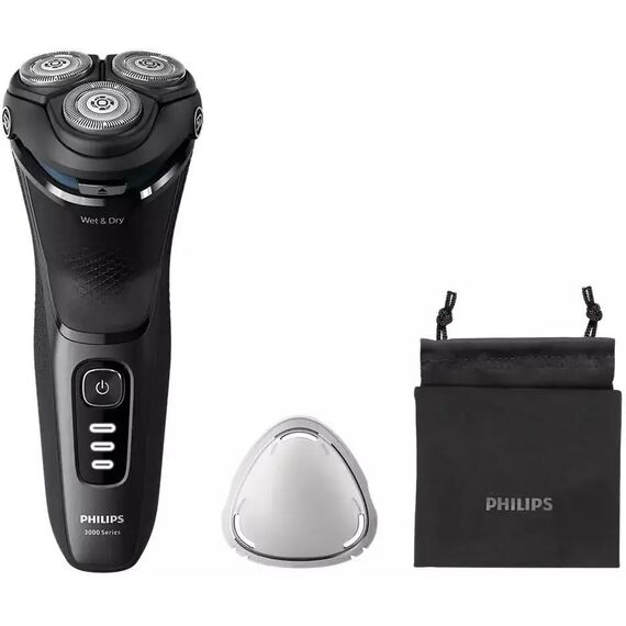 Электробритва для влажного и сухого бритья, роторная, Серия 3000, Время автономной работы 60 мин, 1 час полной зарядки, 5D система повторений контуров лица, лезвия PowerCut, технология SkinProtect, в комплекте: зарядный кабель, защитная крышка, чехол, Ц