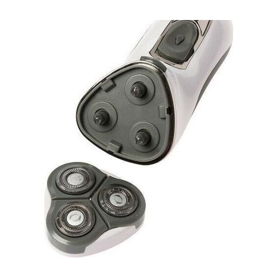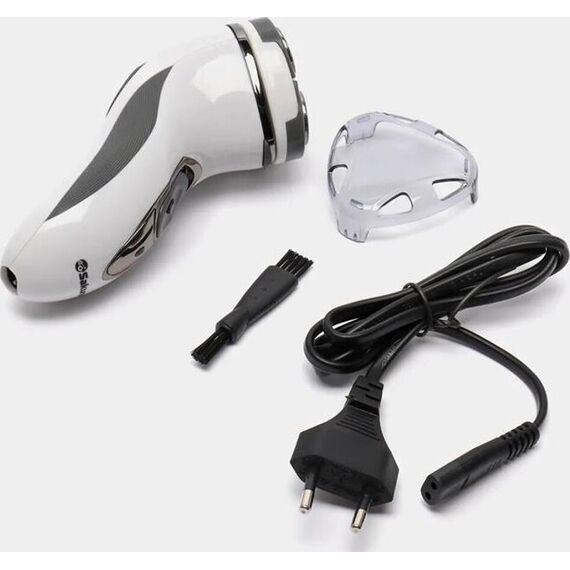 Бритва электрическая, работа от аккумулятора Ni-Cd (600 мА/ч), зарядка от сети 220-240В. 3 плавающие бритвенные головки. Сухое бритье. Бритвенные головки роторные. Щеточка д/очистки, мешочек д/хранения и переноски.