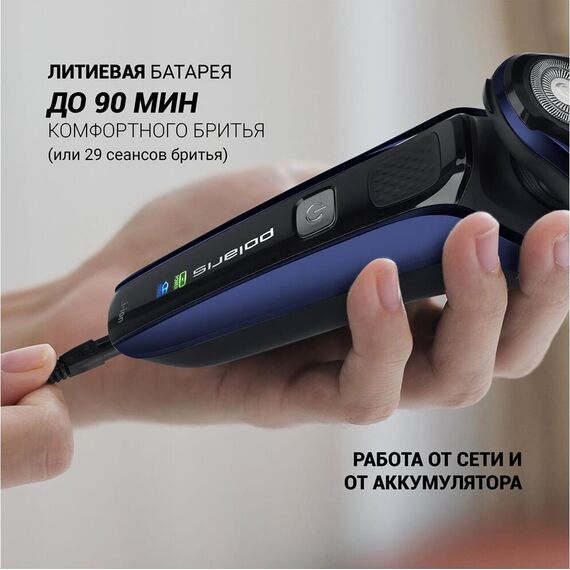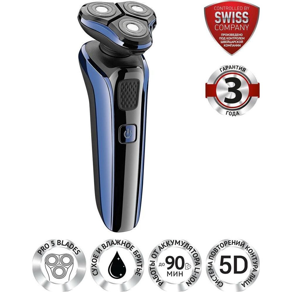 Высокоточные двойные лезвия PRO 5 BLADES.Супергладкие кольца.Сухое и влажное бритье.Работа от сети и от аккумулятора.Литиевая батарея.До 90 мин бритья.Полная зарядка 90 мин.Переключатель ВКЛ./ВЫКЛ.Индикатор заряда. Мощность: 4 Вт.