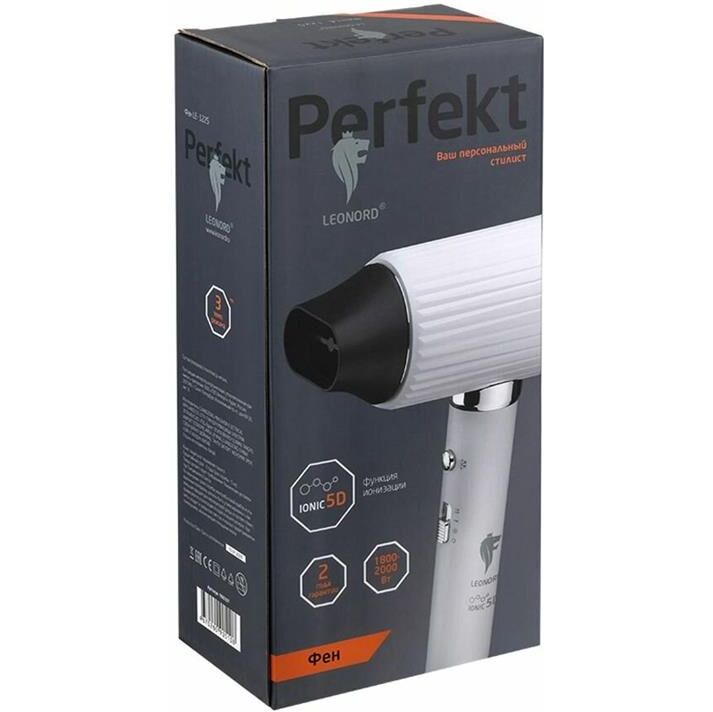 Мощность 1800 -2000 Вт 2 скорости работы 3 температурных режима Режим “Холодный воздух” Функция ионизации «IONIC 5D» Магнитная насадка концентратор DC мотор Автоотключение при перегреве Длина шнура - 1,8 м Состав (материал): пластмасса, металл. Гарантия 2 года