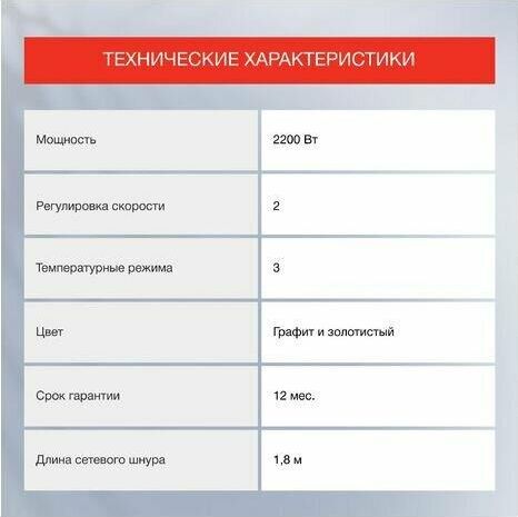 Мощность 2200 Вт 2 скоростных режима 3 температурных режима Ионизация Холодный воздух Концентратор Петля для подвешивания Съемная защитная решетка турмалин Цвет графит/золотистый Срок гарантии 12 мес.