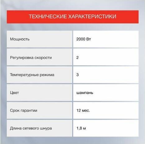 Мощность 2000 Вт 2 скоростных режима 3 температурных режима Ионизация Холодный воздух Концентратор Петля для подвешивания Съемная защитная решетка турмалин Цвет шампань Срок гарантии 12 мес.