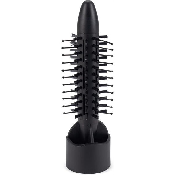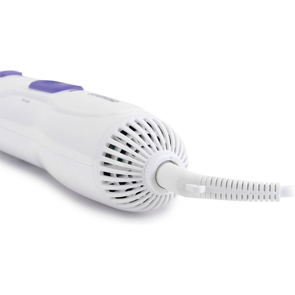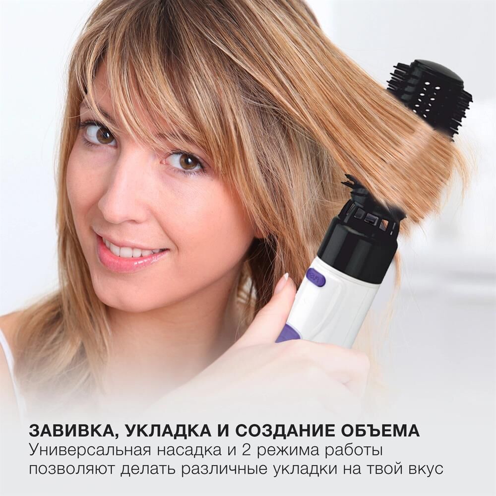 Фен-щетка. Мощность: 1000 Вт. Материал корпуса: пластик. Регулировка скорости: 2. Количество температурных режимов: 2. Диаметр нагревательной втулки: 43мм. Индикация включения. Количество насадок: 2. Функции: автоматическое отключение, защита от перегрева, настройка скорости, холодный воздух. Особенности конструкции: петля для подвешивания, съемный фильтр, шарнирное крепление шнура. Длина сетевого шнура: 1,8 метра. Цвет: белый.