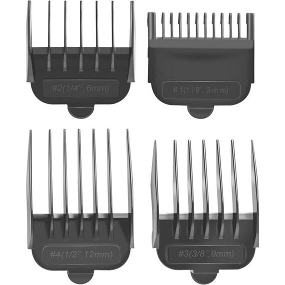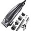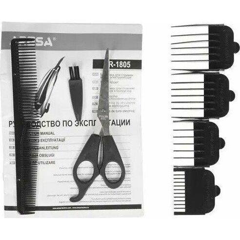 СЕТЕВАЯ МАШИНКА. Мощность 9 Вт. Регулируемая длина лезвия. 4 сменные насадки: 3, 6, 9 и 12 мм. Аксессуары: щеточка для чистки лезвия, расческа, масленка, ножницы.