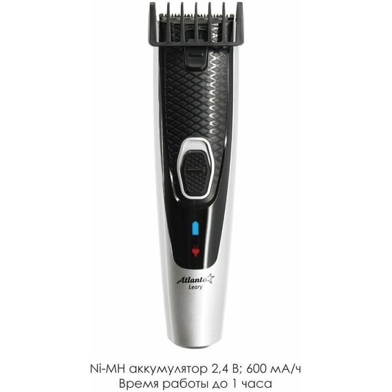 ATLANTA ATH-6911 (BLACK) Машинка для стрижки аккумуляторная Удобная подставка с зарядкой Питание от аккумулятора и через адаптер (1,9 м) Регулируемая насадка: 3, 6, 9, 12,15 мм Функция филировки Дополнительные аксессуары в комплекте Индикатор зарядки Прецизионные ножи из стали высокой прочности Долговечный, мощный аккумулятор Ni-MH 2,4 В; 600 мА/ч